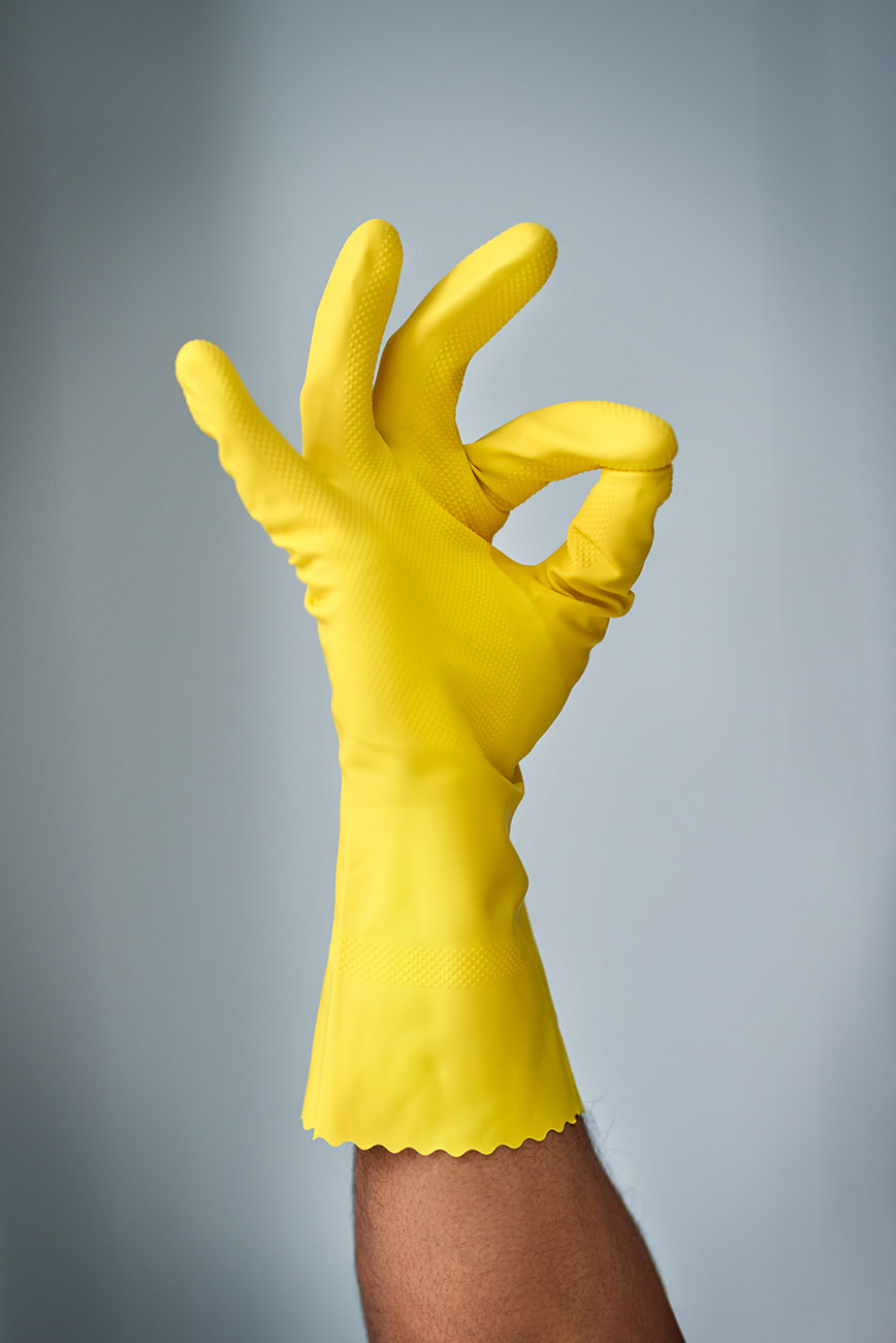 Cropped shot of a man wearing a rubber cleaning glove inside